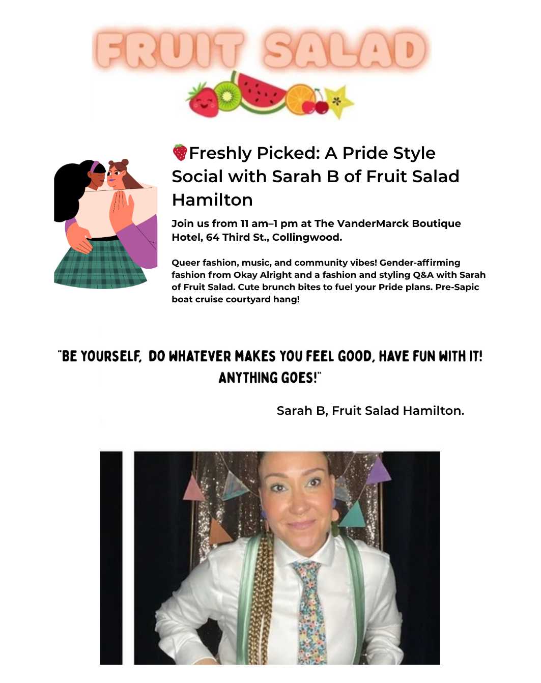 Jul 12 Saturday 🍓Freshly Picked: A Pride Style Social with Sarah B of FruitSalad Hamilton Saturday, July 12, 2025 11:00 AM 1:00 PM The VanderMarck Boutique Hotel (map) Google Calendar ICS LEARN MORE View Event →