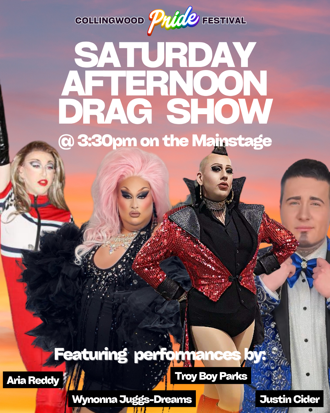 Jul 12 Saturday Drag Show Saturday, July 12, 2025 5:45 PM 6:45 PM Pride Collingwood Festival Grounds (map) Google Calendar ICS LEARN MORE View Event →