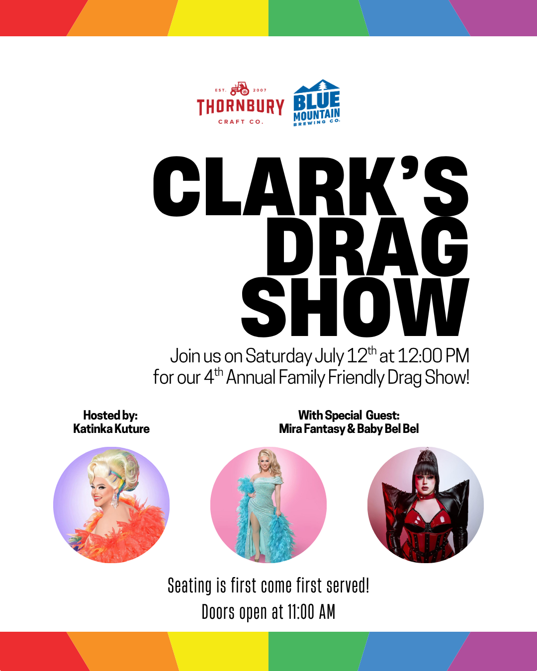 Jul 12 Saturday Clark's 4th Annual Drag Show Saturday, July 12, 2025 12:00 PM 2:00 PM Thornbury Craft Co & Blue Mountain Brewing Co (map) Google Calendar ICS LEARN MORE View Event →