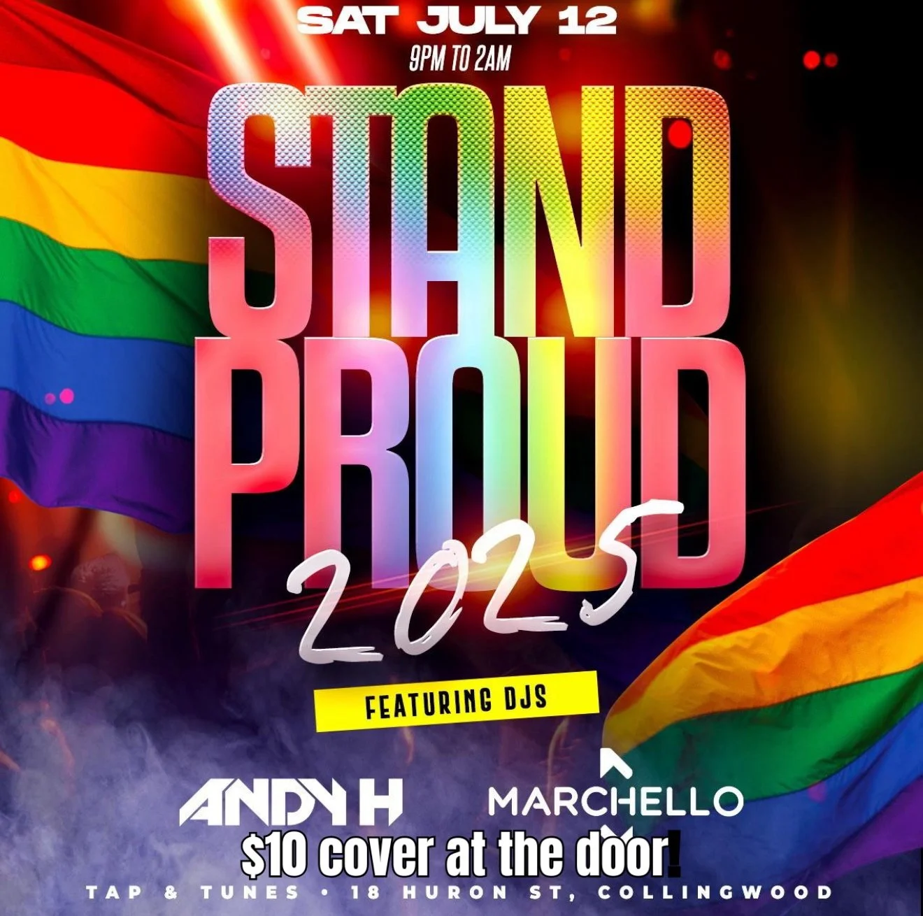Jul 13 Sunday An Endswell Listening Room Show: LITTLE BANJO - LARA EASTBURN WITH GUESTS DREW MARTIN, BEN SITTER & CHLOÉ Sunday, July 13, 2025 2:00 PM 4:30 PM Endswell Brewery (map) Google Calendar ICS LEARN MORE View Event → Jul 13 Sunday Pride Brunch at Side Launch Brewery Sunday, July 13, 2025 11:00 AM 2:00 PM Side Launch (map) Google Calendar ICS LEARN MORE View Event → Jul 13 Sunday Collingwood Pride Drag Brunch Sunday, July 13, 2025 10:00 AM 3:00 PM Prime Seven Nine (map) Google Calendar ICS LEARN MORE View Event → Jul 12 to Jul 13 Saturday TNT Stand Proud After Party Sat, Jul 12, 2025 11:00 PM Sun, Jul 13, 2025 2:00 AM Taps n Tunes (map) Google Calendar ICS LEARN MORE View Event → Jul 12 Saturday DJ Cosmic Cat Saturday, July 12, 2025 10:00 PM 11:00 PM Pride Collingwood Festival Grounds (map) Google Calendar ICS LEARN MORE View Event → Jul 12 Saturday HEADLINER: The 99's Saturday, July 12, 2025 8:30 PM 10:00 PM Pride Collingwood Festival Grounds (map) Google Calendar ICS LEARN MORE View Event → Jul 12 Saturday Drag Show Saturday, July 12, 2025 7:30 PM 8:30 PM Pride Collingwood Festival Grounds (map) Google Calendar ICS LEARN MORE View Event → Jul 12 Saturday Line Dacing with Erin & Mel Saturday, July 12, 2025 7:00 PM 7:15 PM Pride Collingwood Festival Grounds (map) Google Calendar ICS LEARN MORE View Event → Jul 12 Saturday Prime Seven Nine Patio Party Saturday, July 12, 2025 6:00 PM 11:00 PM Prime Seven Nine (map) Google Calendar ICS LEARN MORE View Event → Jul 12 Saturday Drag Show Saturday, July 12, 2025 5:45 PM 6:45 PM Pride Collingwood Festival Grounds (map) Google Calendar ICS LEARN MORE View Event → Jul 12 Saturday Collingwood Pride Parade Saturday, July 12, 2025 5:00 PM 6:00 PM Downtown Collingwood (map) Google Calendar ICS LEARN MORE View Event → Jul 12 Saturday DRAG SHOW Saturday, July 12, 2025 3:30 PM 4:15 PM Pride Collingwood Festival Grounds (map) Google Calendar ICS LEARN MORE View Event → Jul 12 Saturday Pre-Parade Putting Contest at The Dorchester, with Duntroon Highlands Golf Saturday, July 12, 2025 3:30 PM 5:00 PM The Dorchester Collingwood (map) Google Calendar ICS LEARN MORE View Event → Jul 12 Saturday Live Music with Graham Scott Fleming Saturday, July 12, 2025 2:30 PM 3:30 PM Pride Collingwood Festival Zone (map) Google Calendar ICS LEARN MORE View Event → Jul 12 Saturday Groove Dancing with Tyler Boyle Saturday, July 12, 2025 2:00 PM 2:30 PM Pride Collingwood Festival Grounds (map) Google Calendar ICS LEARN MORE View Event → Jul 12 Saturday Sappho at Sea: LOVE BOAT Saturday, July 12, 2025 1:30 PM 4:00 PM Side Launch Way (map) Google Calendar ICS LEARN MORE View Event → Jul 12 Saturday Live Music with Sydney Riley Saturday, July 12, 2025 1:00 PM 2:00 PM Pride Collingwood Festival Grounds (map) Google Calendar ICS LEARN MORE View Event → Jul 12 Saturday Vendor Market Saturday, July 12, 2025 12:01 PM 4:00 PM Pride Collingwood Festival Grounds (map) Google Calendar ICS LEARN MORE View Event → Jul 12 Saturday Family Zone Saturday, July 12, 2025 12:01 PM 4:00 PM Pride Collingwood Festival Grounds (map) Google Calendar ICS LEARN MORE View Event → Jul 12 Saturday Downtown Collingwood Train Rides! Saturday, July 12, 2025 12:01 PM 4:00 PM Downtown Collingwood (map) Google Calendar ICS LEARN MORE View Event → Jul 12 Saturday Festival Zone Opens Saturday, July 12, 2025 12:00 PM 11:00 PM Pride Festival Grounds (map) Google Calendar ICS LEARN MORE View Event → Jul 12 Saturday Clark's 4th Annual Drag Show Saturday, July 12, 2025 12:00 PM 2:00 PM Thornbury Craft Co & Blue Mountain Brewing Co (map) Google Calendar ICS LEARN MORE View Event → Jul 12 Saturday 🍓Freshly Picked: A Pride Style Social with Sarah B of FruitSalad Hamilton Saturday, July 12, 2025 11:00 AM 1:00 PM The VanderMarck Boutique Hotel (map) Google Calendar ICS LEARN MORE View Event → Jul 12 Saturday Hello Pottery Pride Mugs Saturday, July 12, 2025 10:00 AM 12:00 PM Hello Pottery co (map) Google Calendar ICS LEARN MORE View Event → Jul 12 Saturday PRIDE Yoga at Sunset Point Saturday, July 12, 2025 10:00 AM 11:30 AM Sunset Point (map) Google Calendar ICS LEARN MORE View Event → Jul 12 Saturday Wake & Rave Morning Coffee Party at Press Market Saturday, July 12, 2025 9:00 AM 11:00 AM Press Market (map) Google Calendar ICS LEARN MORE View Event → Jul 12 Saturday Becker Shoes Hoka Pride Run Saturday, July 12, 2025 8:30 AM 10:00 AM Becker Shoes (map) Google Calendar ICS LEARN MORE View Event → Jul 11 to Jul 12 Friday TNT After Party Fri, Jul 11, 2025 11:00 PM Sat, Jul 12, 2025 2:00 AM Taps n Tunes (map) Google Calendar ICS LEARN MORE View Event → Jul 11 Friday DJ Thom Hardy Friday, July 11, 2025 10:00 PM 11:00 PM Pride Collingwood Festival Grounds (map) Google Calendar ICS LEARN MORE View Event → Jul 11 Friday HEADLINER: Shania Twink! Friday, July 11, 2025 8:30 PM 10:00 PM Pride Collingwood Festival Grounds (map) Google Calendar ICS LEARN MORE View Event →
